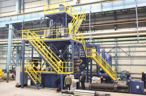 3.線材拋丸清理機的箱式外置拋丸器清理室改為內置式拋丸器清理室,彈丸近距離打擊在線材工件上,大大增加了清理除銹效率、效果.四臺拋丸器兩兩間隔180度布置,增強了彈丸清理的線材的均勻性和全包圍性,解決了工件在清理過程中出現“陰陽面”問題.