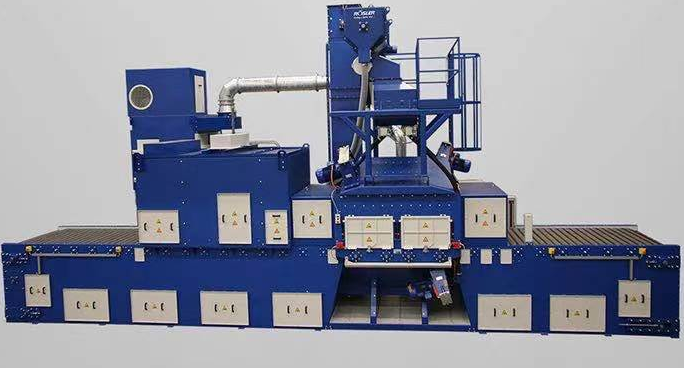 鋼板拋丸機是多數(shù)板材軋鋼廠必備的基礎設備,現(xiàn)在使用的都是輥道式鋼板拋丸機,它將不同厚度的一張張鋼板連續(xù)自動的進行表面潔凈處理,然后按照客戶要求進一步熱處理或防腐處理。鋼板拋丸機通過高速旋轉(zhuǎn)的拋頭葉輪將鋼丸以高速度拋投到鋼板表面,擊打磨削鋼板表面。拋頭分布在鋼板運輸輥道上下兩側,錯落放置。根據(jù)鋼板寬度的不同上下兩側的拋頭也不相同,同時調(diào)節(jié)鋼板在輥道上的傳輸速度和控制拋頭的鋼丸量,能對移動中的鋼板進行完美的拋丸處理。